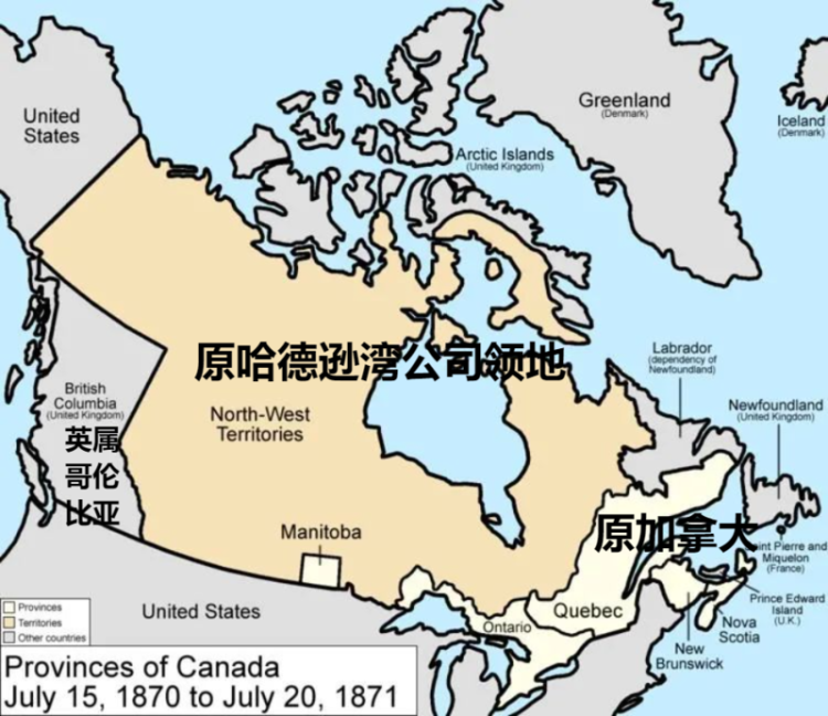 此时,加拿大仅包括东部沿海和五大湖地区的四省,占今天加拿大面积的1/8.西北部广大地区、不列颠哥伦比亚因为开发较晚、人口较少,依然是英国的殖民地。