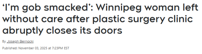 “我整个人都懵了。”温尼伯Transcona女子Deirdre Demeule最近接到一个电话,让她彻底傻眼——她常去的整形诊所Ziesmann Cosmetics,突然永久关门了。