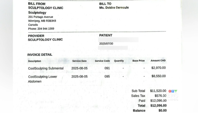Demeule透露,她在该诊所支付了两轮酷塑(CoolSculpting)减脂疗程的费用,总价高达12.000加元,包含了所有后续护理。
