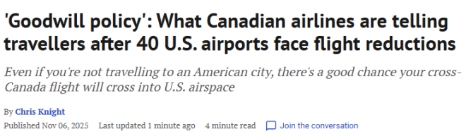 换句话说,即便是加拿大国内航班或飞往南方度假的航线,也可能因为美国空管系统的吃紧而受影响。