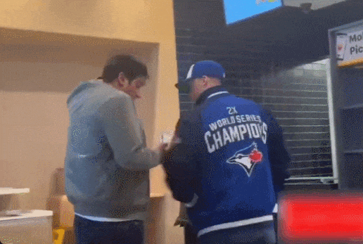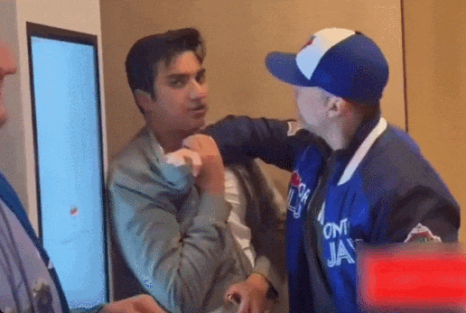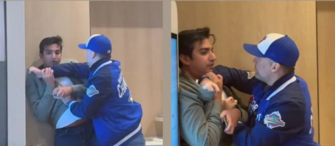 视频显示,冲突发生在“手机点餐取餐区”(Mobile Order Pick Up)附近。一名身穿多伦多蓝鸟队夹克的白人男子走向一名正在看手机的印度裔顾客。