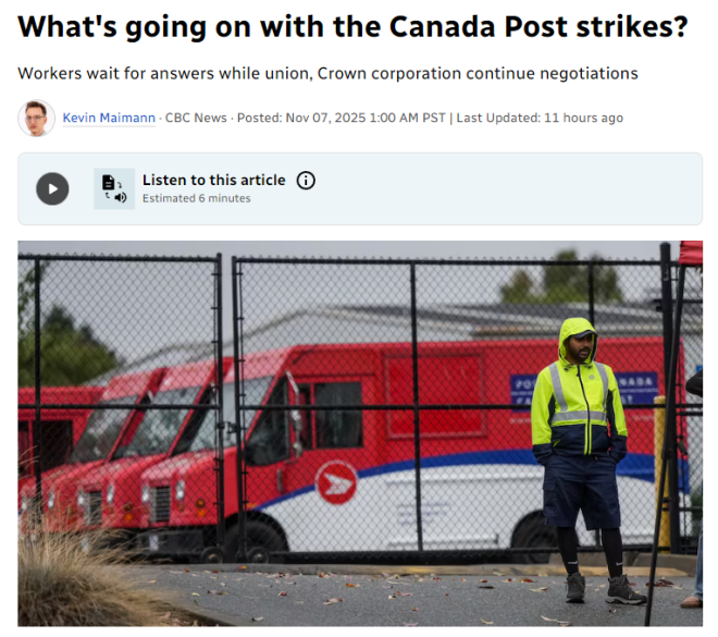 最近,加拿大邮政(Canada Post)的轮流罢工已经持续一个多月,但工人和依赖邮政服务的企业依然陷入不确定的局面中。邮政工会与政府控股公司之间的谈判仍在继续,而一线员工则在等待结果。