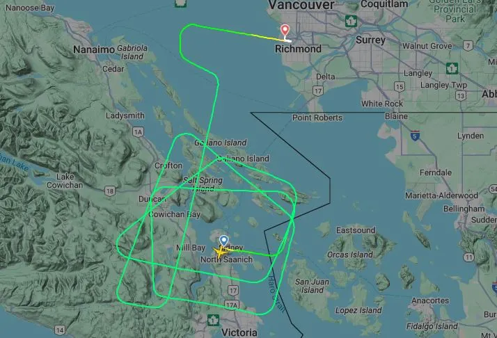 Flightradar24网站上的飞行路线图显示,飞机在温哥华岛上空盘旋排空燃油,从而完成紧急迫降。欲了解更多,可以点击观看该航线的重播。