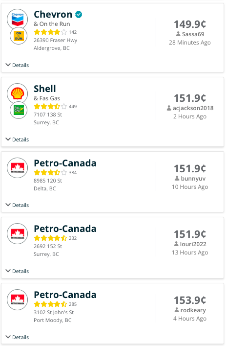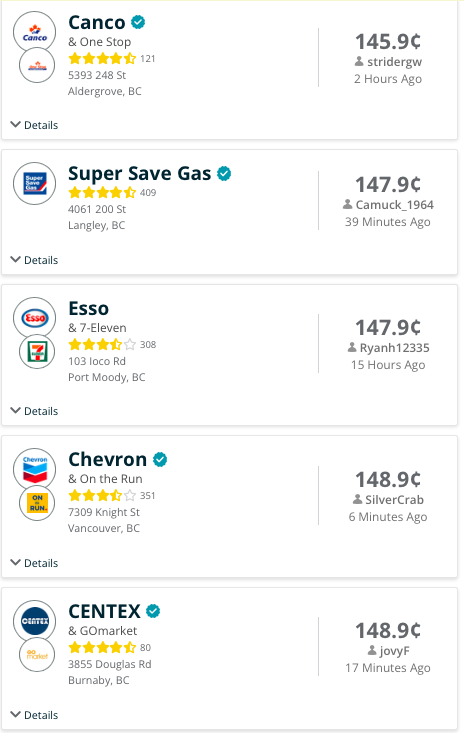 大温这十间油站入油最便宜总有一家就在你附近2025-11-08 17:11都市网+-据汽油消息网站gasbuddy于周六(8日)中午12时左右的页面显示,大温地区十间最平油价的油站资料如下图所示,供司机们参考:0