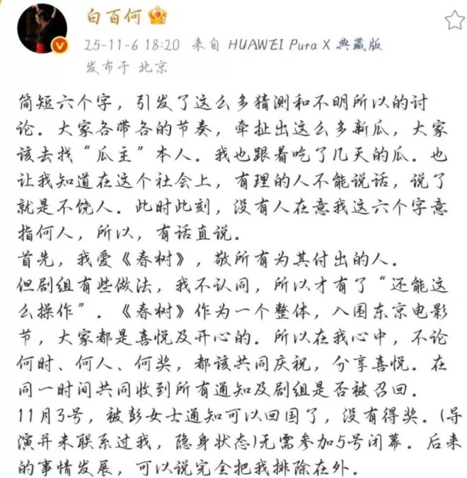 《春树》剧组入围东京电影节,白百何被告知没有获奖,要求先回国。