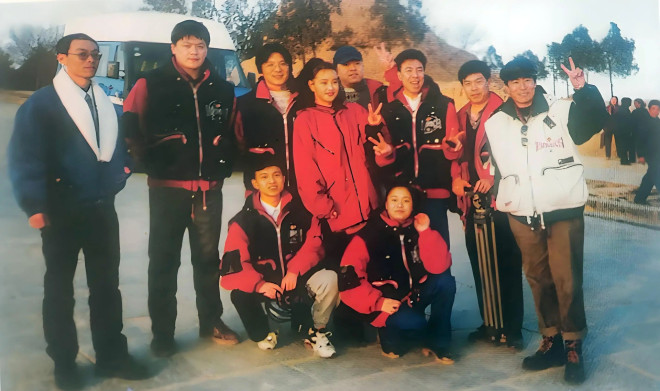刘晓庆(中)与《刘晓庆:打开引号》剧组在西安(1995年)