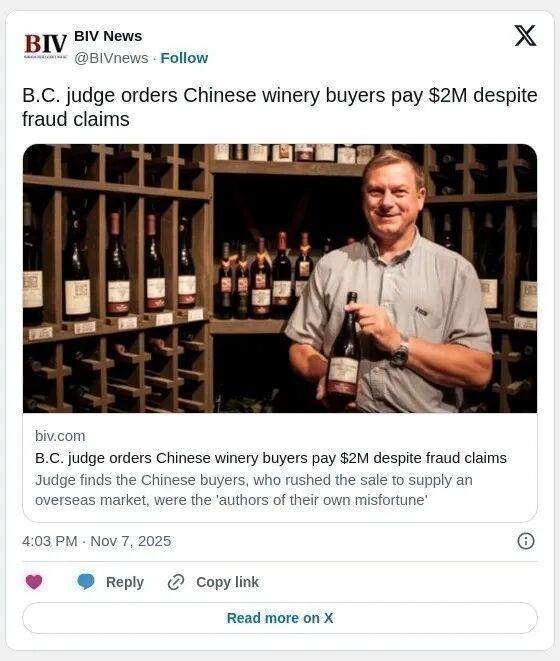 BC省法官下令内陆一家酒庄的中国买家支付200万加元,尽管他们声称卖家存在欺诈行为。法官认为,这些中国买家为了向海外市场急于出售酒庄,导致这样的结果。