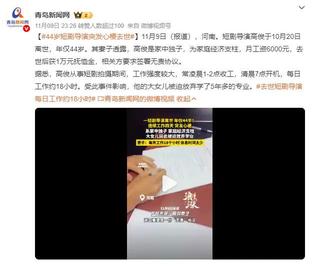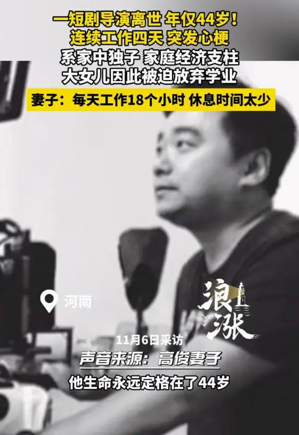 44岁短剧导演突发心梗去世 每日工作约18小时