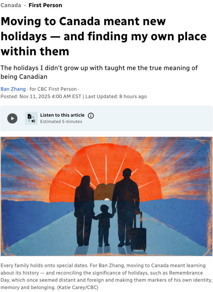 今天(11月11日)是加拿大国殇纪念日(Remembrance Day),CBC刊登一篇华人移民张先生(Ban Zhang,音译)以第一人称写的文章,讲述移民对加拿大本地节日理解的点点滴滴。