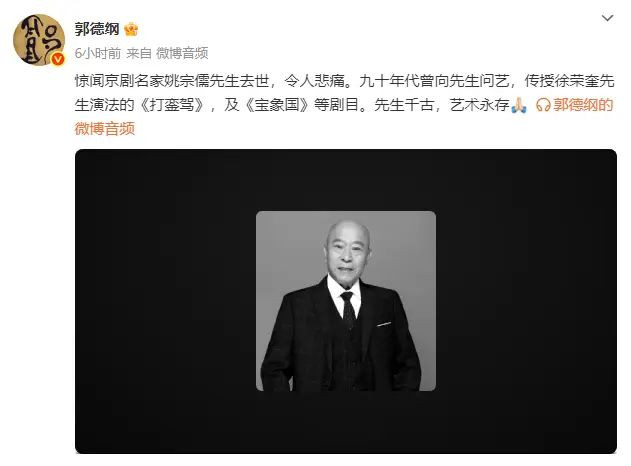 12日,郭德纲在社交平台上发文悼念京剧名家姚宗儒:“惊闻京剧名家姚宗儒先生去世,令人悲痛。