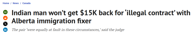 一名印度男子向中介支付了$15.000.试图延长在加拿大的工作签证,但最终失败。阿尔伯塔法院最新裁定,这笔合同属于“非法合同”,他没有权利要回钱。