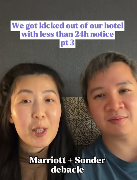 这对情侣同样在周日下午收到两封来自万豪和Sonder的“驱逐”邮件,要求他们立即办理退房,第二天上午9点必须离开。