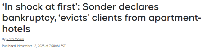 本周一(11月10日),Sonder正式宣布立即停止运营并清算全球业务。原因在于公司未能履行付款义务,全球酒店巨头万豪(Marriott)因此终止了与Sonder的许可协议。