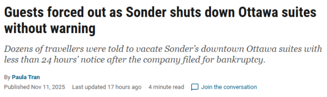 近日,全球精品酒店连锁品牌Sonder突然破产关门,多伦多、蒙特利尔、渥太华、以及全球各地数千住客被迫在24小时内离开酒店,员工也在数小时内集体失业......整个事件让人震惊不已。