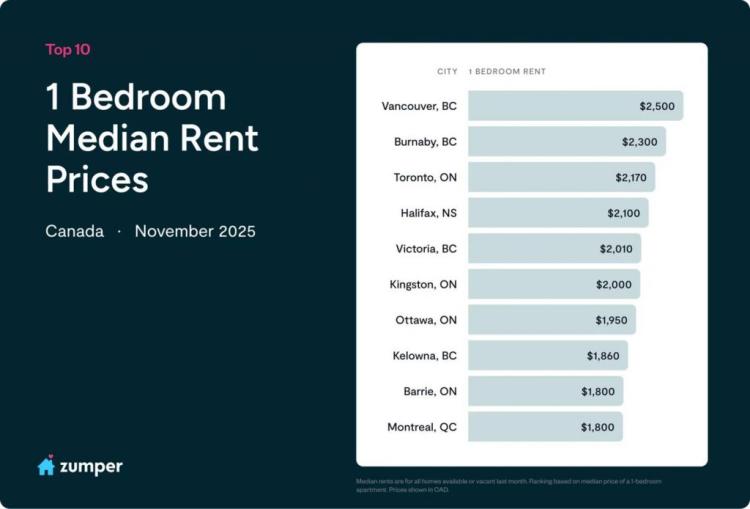 Zumper加拿大租金报告分析了全国超过5万个活跃房源的租赁数据。这些数据按月汇总,以计算租金中位数。