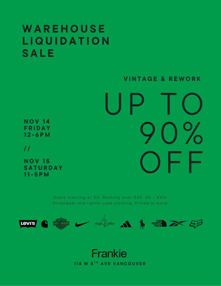 Frankie Collective将于11月14日周五及11月15日周六举办各种名牌衣服的清仓特卖会,部分商品的折扣高达90%!