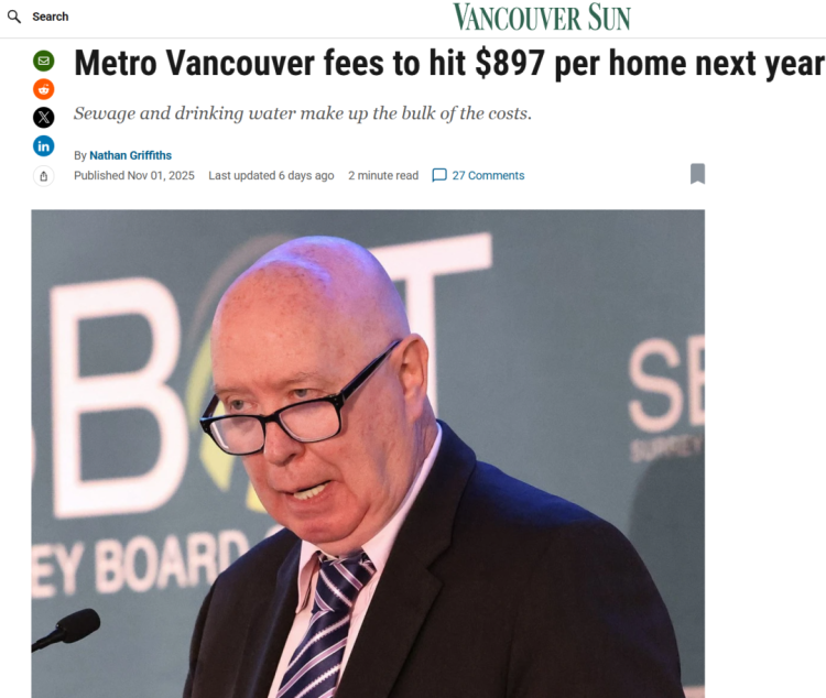 除了温哥华市本身,大温地区政府最近也公布了2026年的区域公用事业收费:普通家庭平均每月要为区域性服务(包括水、污水、垃圾等)支付75加元,一年合计897加元,比去年上涨2.5%。