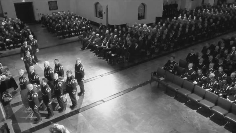温哥华市中心的街道周五(14日)弥漫备极哀荣的沉重气氛,数百名身穿整齐制服的消防员,列队于圣安德烈卫斯理堂(St. Andrew's Wesley Church)外,夹道送别温哥华消防局署理队长奥斯汀(Neil Austin)。