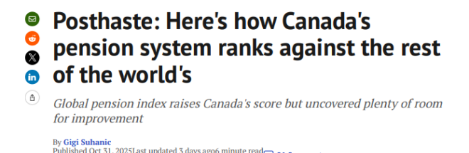 在Mercer和CFA协会全球研究院携手发布的《2025年全球养老金指数》里面,加拿大养老金体系再次拿到“B”等评级,跟去年处于同一水平,但分数从68.4攀升至70.4.