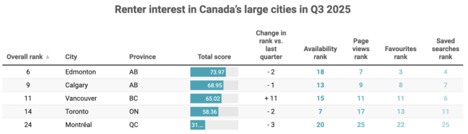 在《2025年第三季度大城市租客兴趣报告》中,温哥华的综合得分为65.02.明显高于第二季度的50.25.这个评分主要考察四个指标:可租房源数量、浏览量、收藏次数和保存搜索。