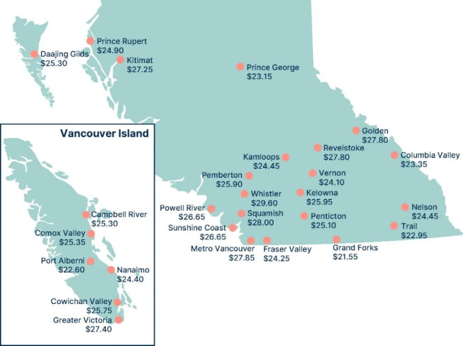 以旅游业为主的温哥华惠斯勒(Whistler,29.60 加元)和雷夫尔斯托克(Revelstoke,27.42 加元)的生活工资也有所上涨。