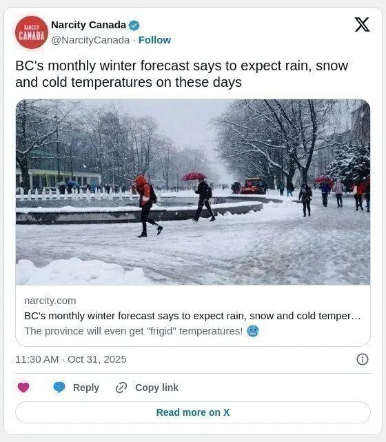 以下是BC省冬季从11月到次年3月每周的天气预报 :