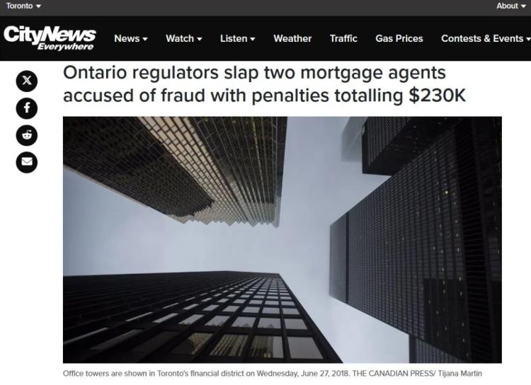 10月19日,安省金融服务监管局宣布,对两名大多伦多地区的前房贷经纪处以总额高达23万加元的行政罚款。
