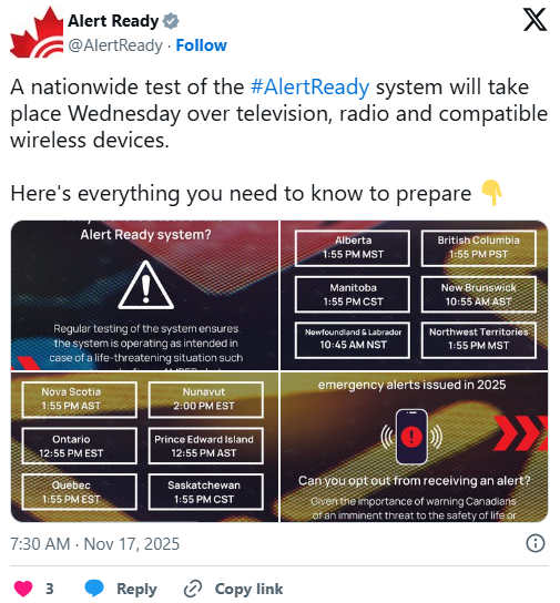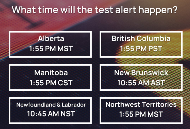 这次全国测试将在11月19日(周三)进行,加拿大13个省区会在不同时间收到测试信息。