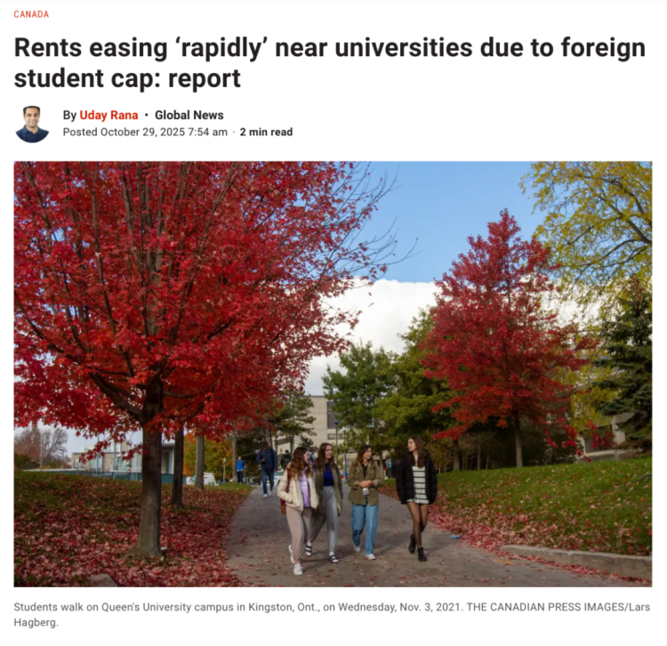Rentals.ca周二发布的一份报告称,加拿大限制国际学生入境人数的政策导致学生租赁市场“迅速降温”。数据显示,自联邦政府去年实施国际学生人数上限以来,学生高度集中的城市租金降幅最大。