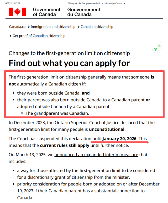 在2023年12月19日之前出生或被收养,且因“第一代限制”而无法获得加拿大公民身份的人;