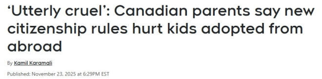 然而,居住在加拿大、从海外收养孩子的加拿大家庭却表示,新法缺少一个关键修正,无法让他们收养的孩子如同在加拿大出生的孩子一样,自动获得公民待遇。