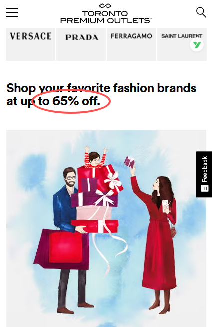 不过,谁会和折扣过不去呢?打开Premium Outlets的官网,果然已经推出了黑五折扣活动页面。该页面写道:“这是一个送礼的季节,在多伦多Premium Outlets可以享受最低35折(最高 65% off)。”