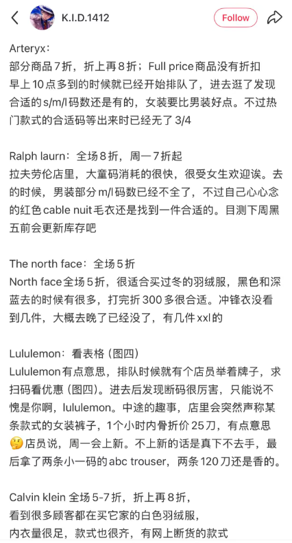 这位贴心的网友给大家盘点了Outlets里的折扣:始祖鸟7折;北脸5折;Lululemon在现场搞"限时特价";阿迪5折;Coach5折...