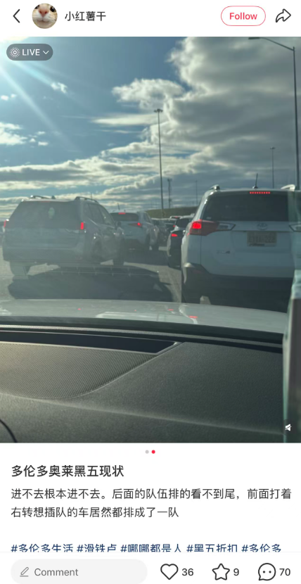 此外,不少华人也被堵在了前往Premium Outlets的路上!小红书上一位网友在周六下午2点左右发帖表示:“进不去啊!根本进不去!后面的队伍排的看不到尾 ,前面打着右转想插队的车居然都排成了一队。”