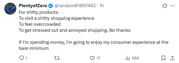 甚至有人觉得Premium Outlets已经太low了:“产品质量差;购物体验差;过度拥挤的环境;让人感到压力和烦躁。我真的是谢谢了。如果我要花钱,至少也要享受到基本的消费体验。”