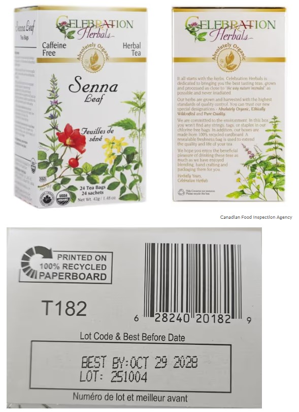 加拿大人被敦促检查家中是否有 Celebrations Herbals 品牌的番泻叶草本茶(24 茶包装)。通用产品代码 (UPC) 为 6 28240 20182 9,批号为 251004。最佳食用日期为 2028 年 10 月 29 日。