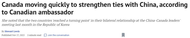 她在周四接受《中国日报》采访时表示,她期待总理卡尼访问中国。本周早些时候,在纪念加中建交55周年的招待会上,她透露卡尼已接受北京的邀请,将在双方“都方便的时间”访华。该活动由中国人民对外友好协会与加拿大驻华大使馆于周三晚在北京联合举办。
