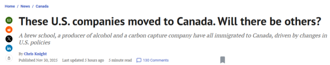 在美加贸易战带来的经济不确定性中,也有一些好消息。受川普政府在贸易政策、移民政策甚至能源法规上的变化影响,一些公司选择离开美国,把总部搬到加拿大。