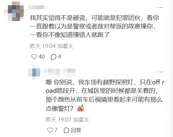 对此,车主回应:车辆顶部装有越野探照灯,平时在城里都是关着的。但从前车后视镜看过去,灯具的位置与外观确实容易让人误认为是警用设备,也不排除对方因误判而产生过度反应。