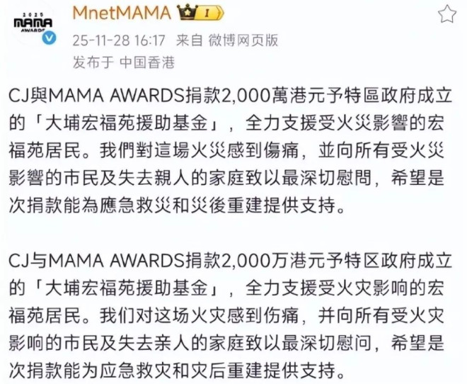 火灾发生之后,主办方捐出了2000万港元救助款项,并决定不取消原有的安排。