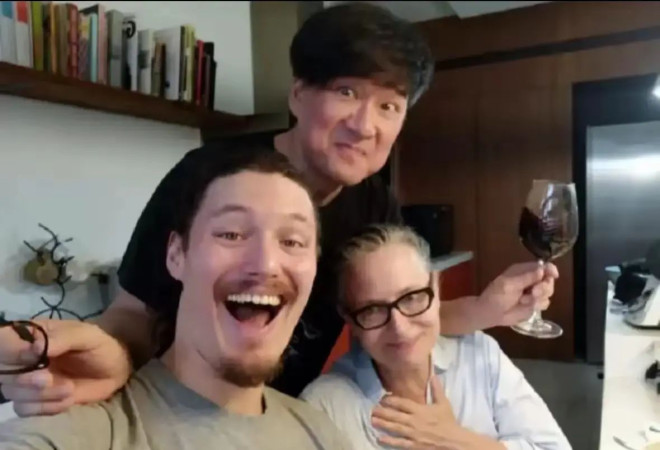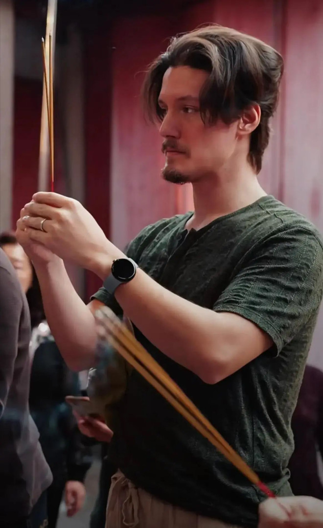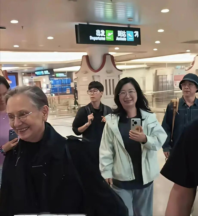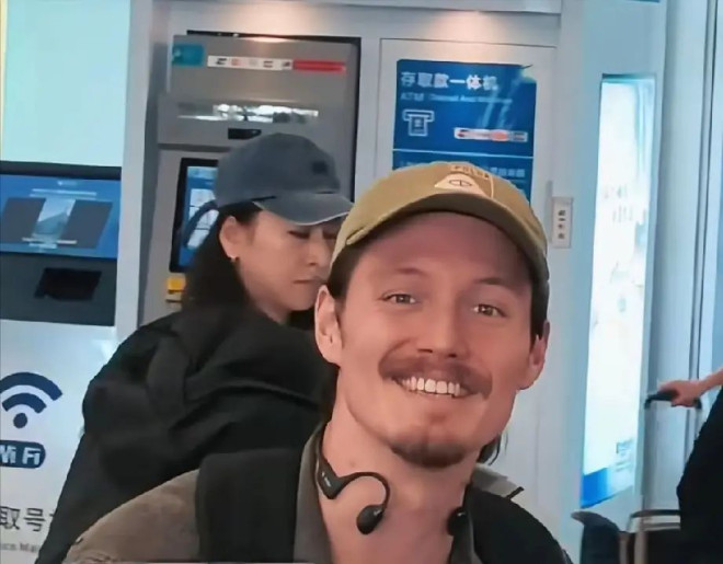 机场出口,一位黑衣男子拖着行李,身边是满头白发的高挑女性,后头还跟着一个五官深邃、步履稳重的“外国大叔”。