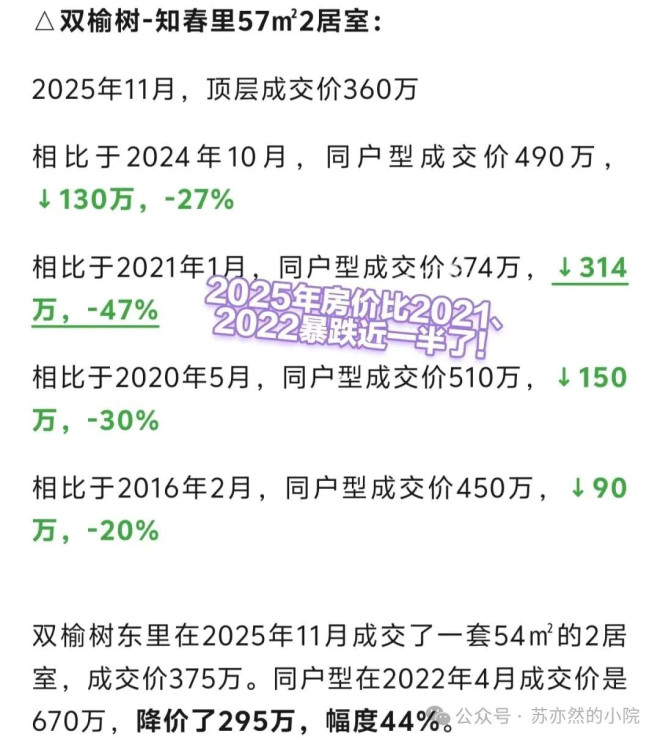 据说,像北三环双榆树知春里、双榆树东里、甚至苏州桥三义庙,不少房子也是比前几年降幅在43%~47%。