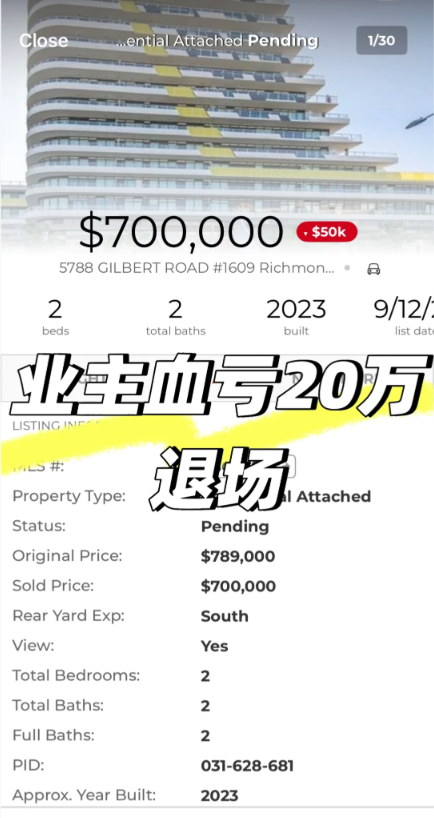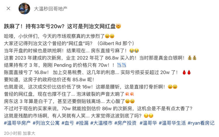 但这还不是最炸裂的。列治文那些当年靠“热度”封神的网红盘,现在也撑不住了。有小红书网友贴出一套2023年建的新盘,业主2022年花86.8万买的,现在pending价格只剩70万。也就是说,短短三年账面亏了16.8万,加上税费和这几年利息,实际亏损稳超20万。