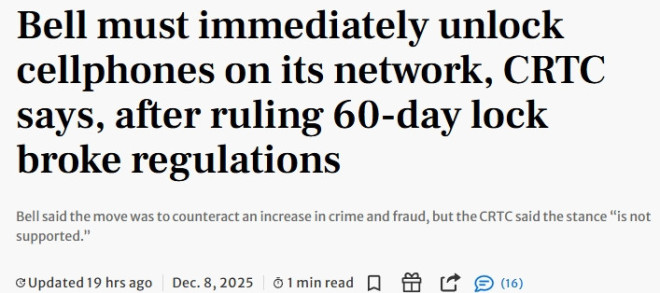 CRTC已要求Bell立即停止这一做法,并免费为网络上的所有手机解锁。