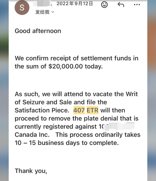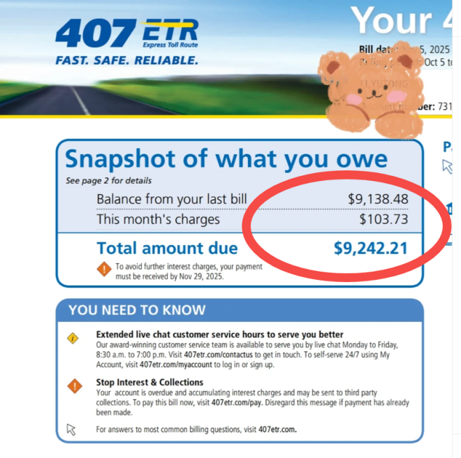 多伦多一位华人回国几年,返加后忽然接407欠费账单9242加元,哭笑不得,只能先忍痛付了账单,留待以后慢慢与407交涉。