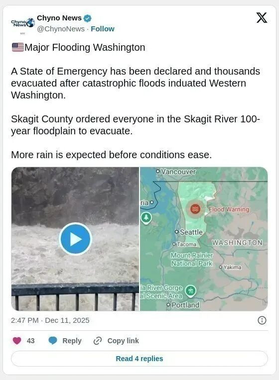 华盛顿州州长紧急向联邦求助,美国总统也迅速签署了灾难紧急状态声明,为联邦救灾力量介入铺路。但即便如此,当地官员依然反复强调:最危险的时间,还没过去。接下来几天,考验的不只是河道,而是堤坝能不能撑住。