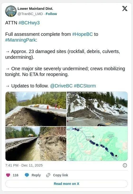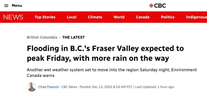 加拿大环境部已经发出特别天气声明,明确指出:菲沙河谷的土地已经完全饱和,接下来哪怕不是暴雨,也可能带来新的问题。周末、下周初,新的天气系统还在路上,山体滑坡、路基塌陷的风险依然存在。