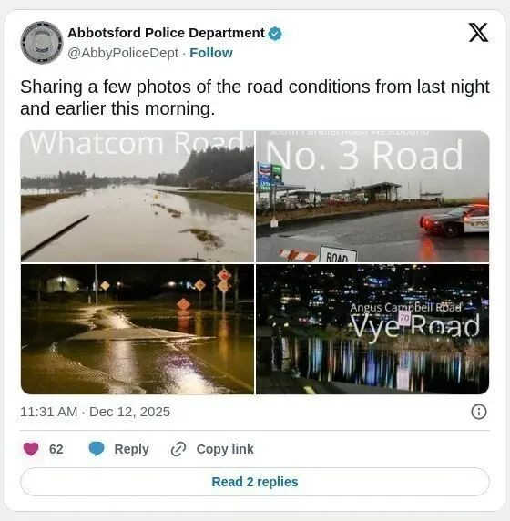 政府警告Abbotsford市民,千万别开车过被淹的路。因为这些路段能见度极差、路基不稳、暗流涌动,这种天气下最危险的不是水深,而是看不出路在哪。