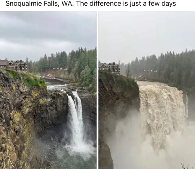 就连平时作为旅游名片的斯诺夸尔米瀑布,这次也完全换了模样。瀑布不再是“流”,而是整片水墙在倾倒,像一条失控的大河。有人说,这是他们一辈子见过最可怕的一次洪水。