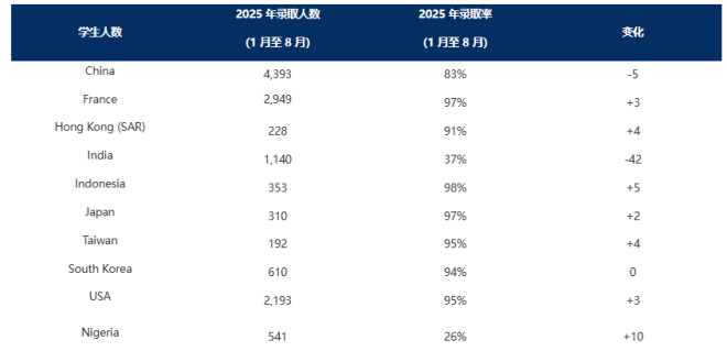 或许更令人鼓舞的是,一些新兴学生群体的录取率也呈现上升趋势。来自印尼、日本和香港的学生群体仍然稳定可靠,获批率超过90%,许多以往获准率较低的国家也实现了显着成长。